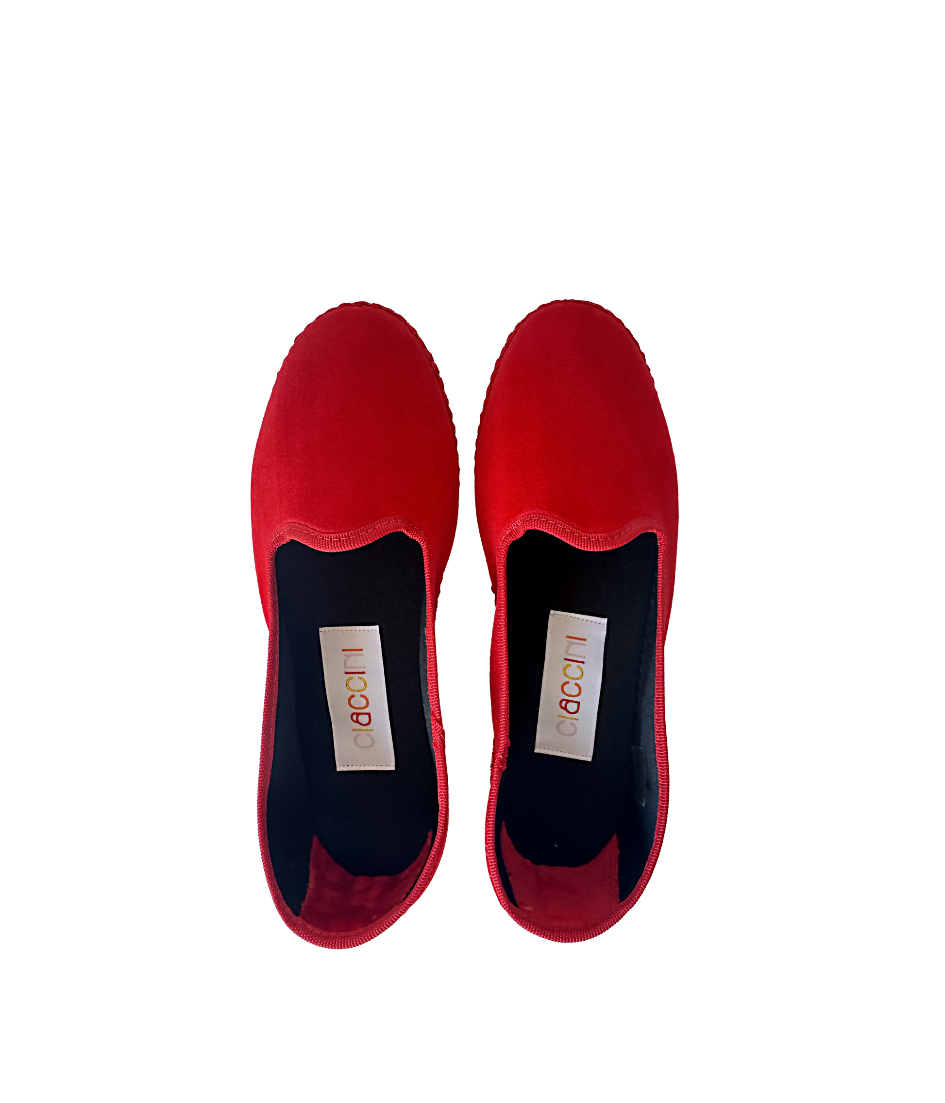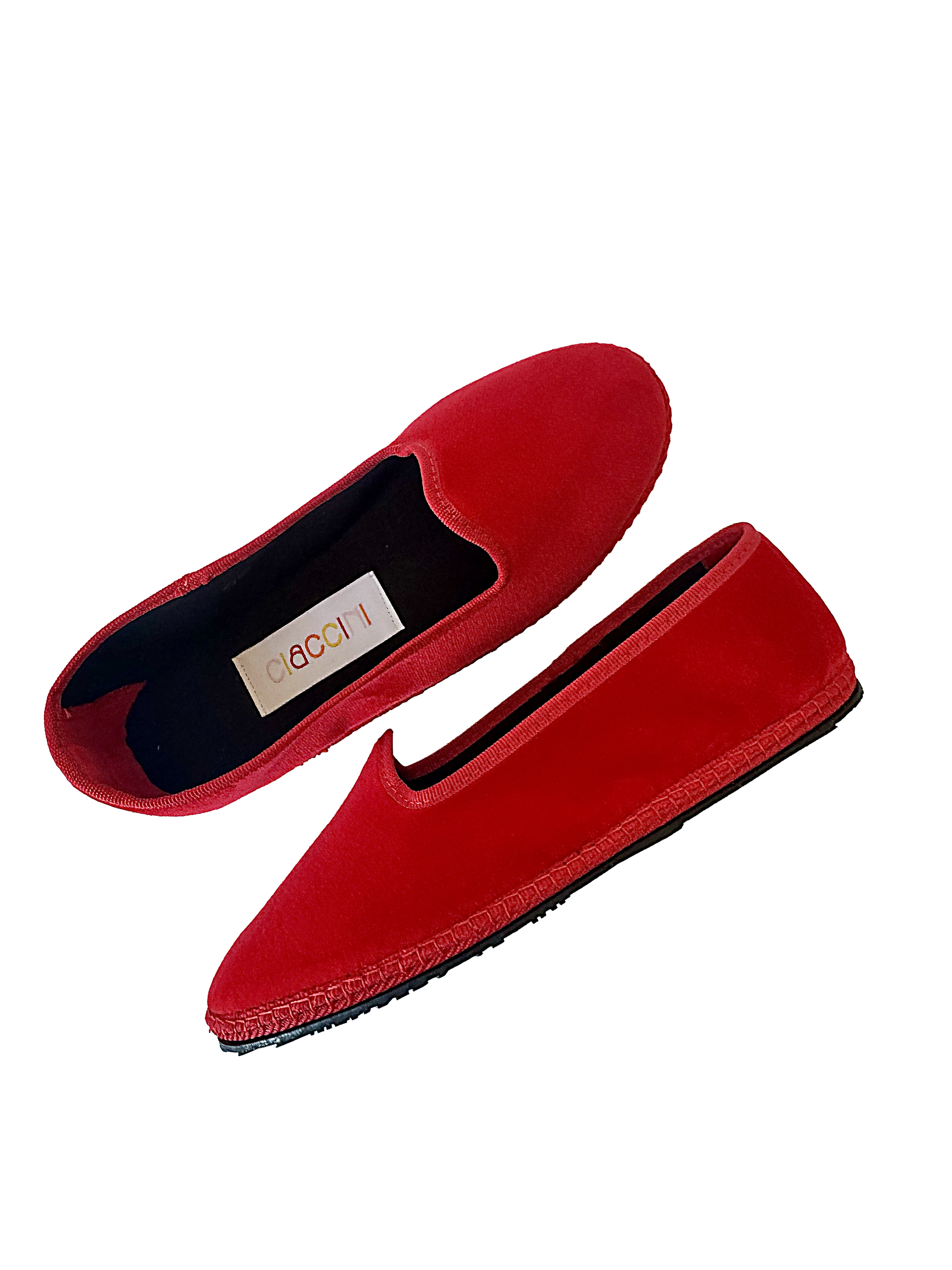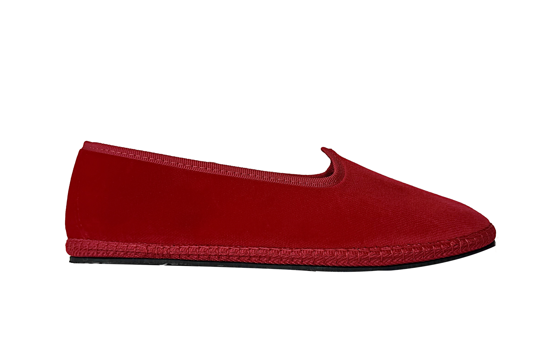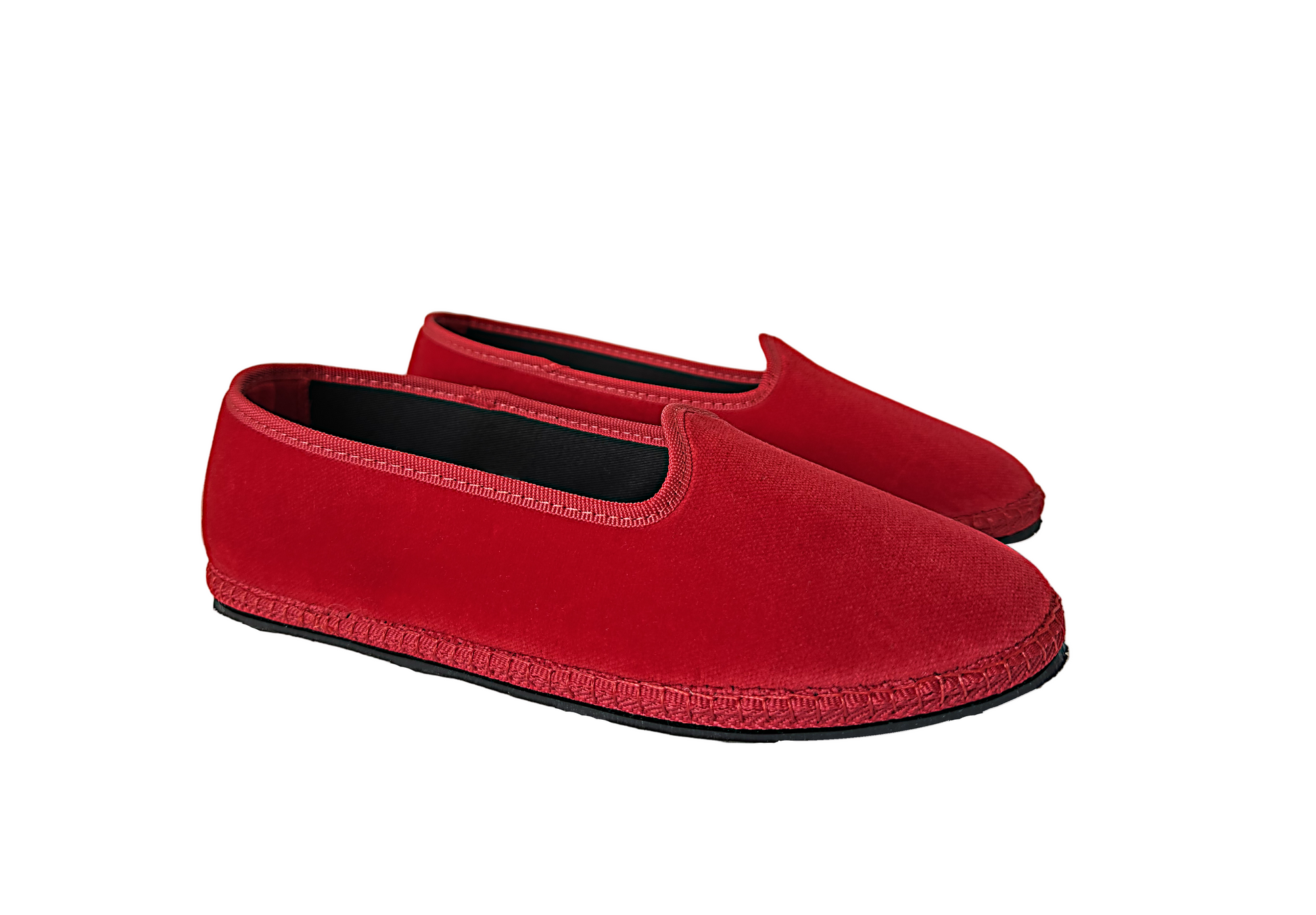 Traditionally made in red velvet and tone-on-tone grosgrain. Recycled bike tire soles.