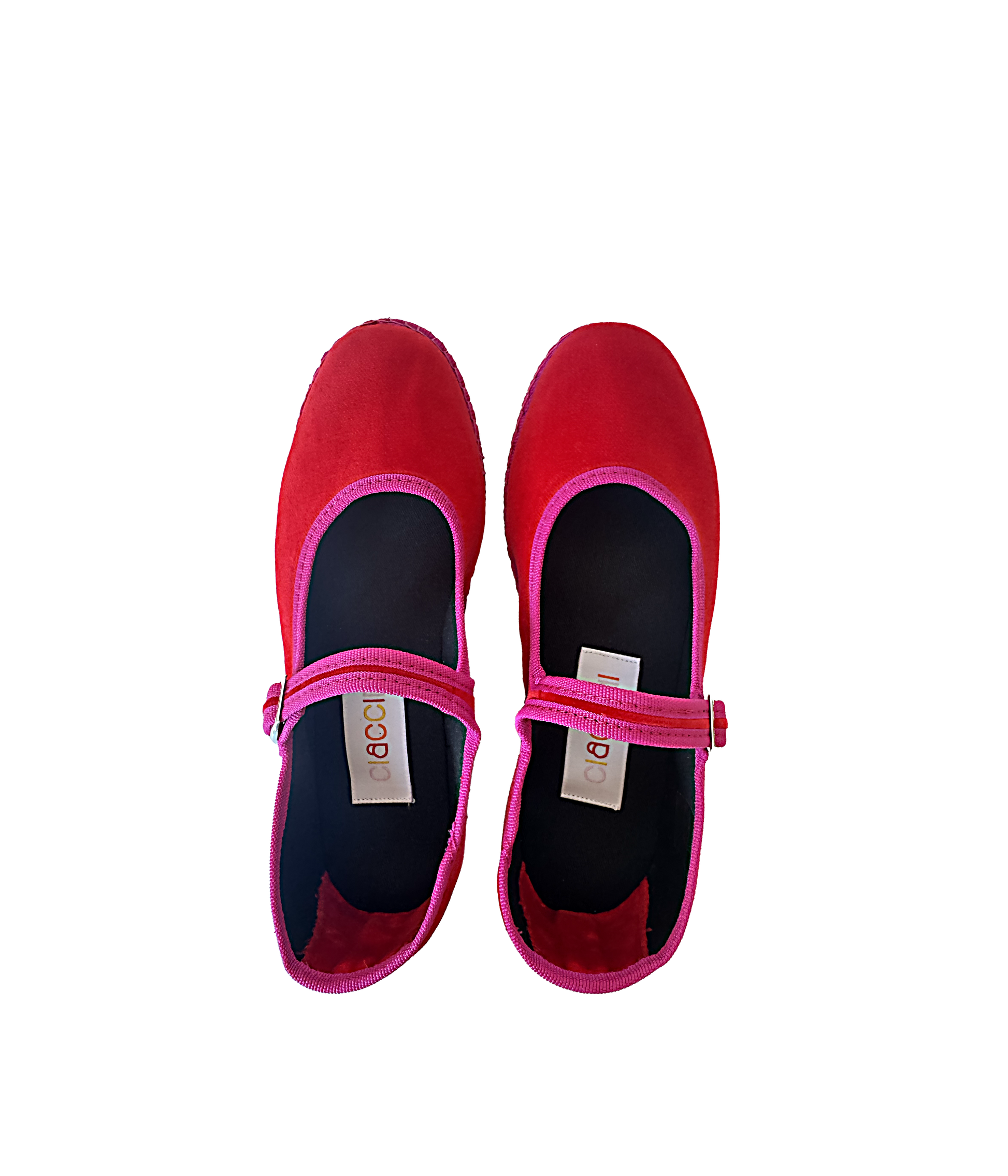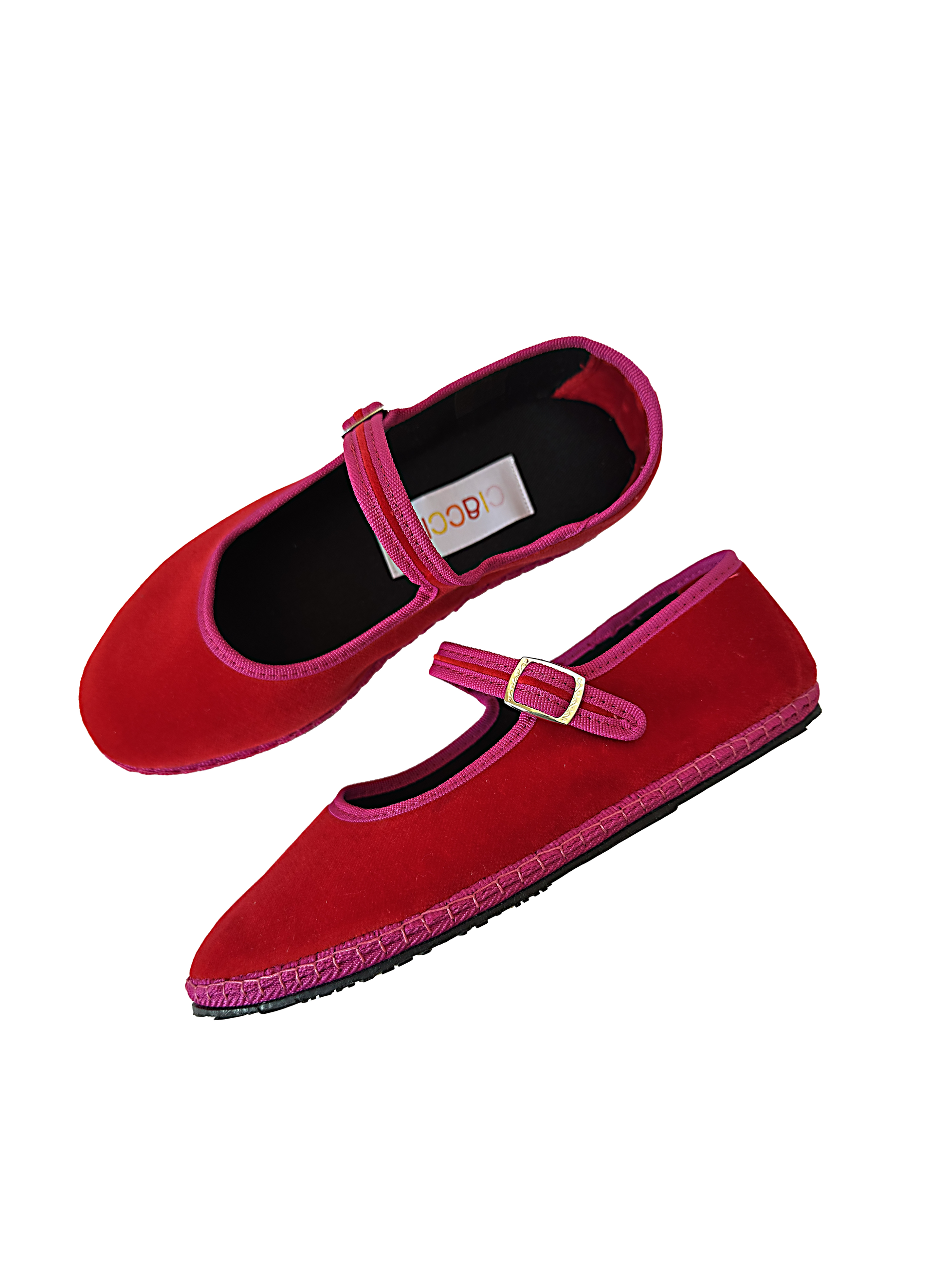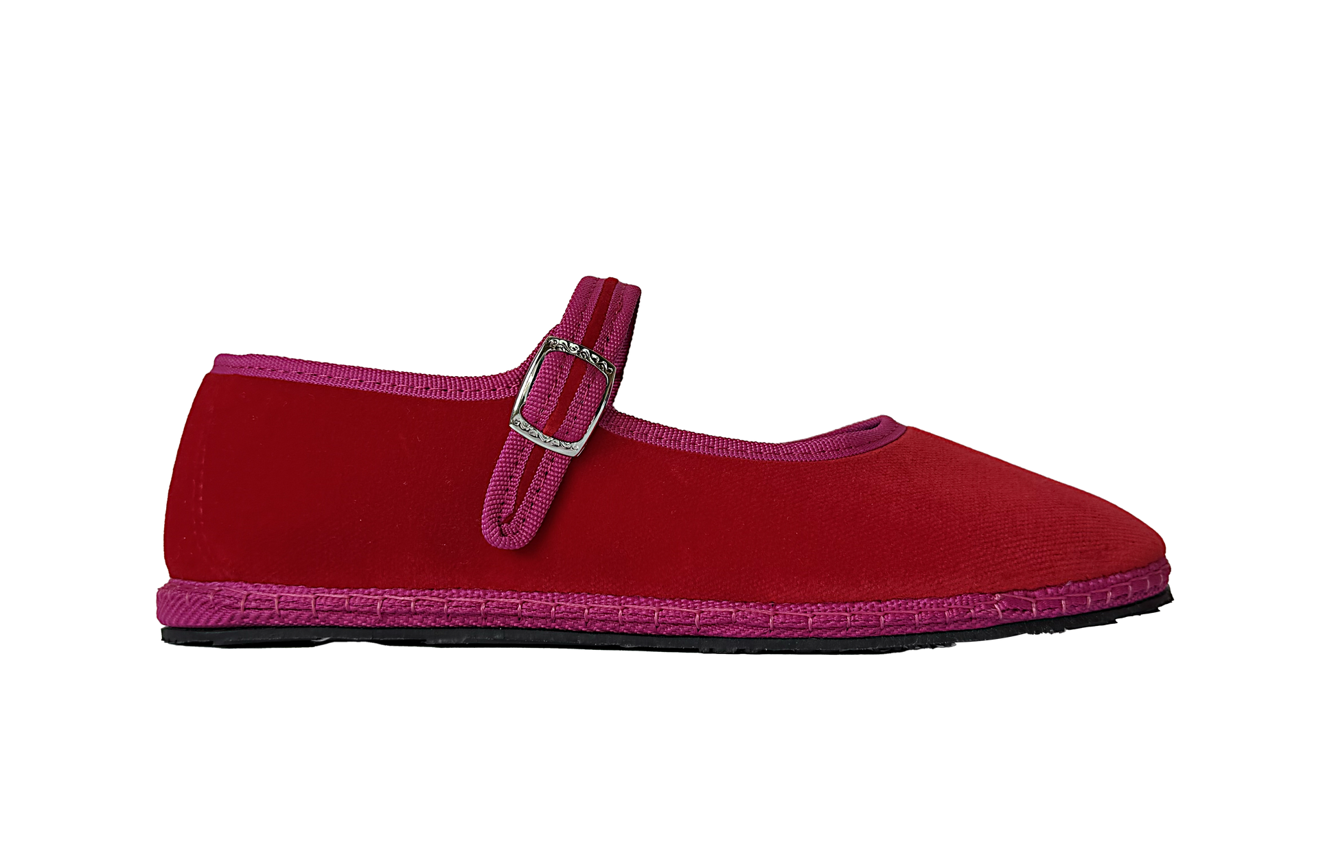Traditionally made in red velvet and contrasting fucsia grosgrain. Recycled bike tire soles.